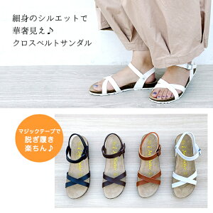スタッフのコメント 足首のストラップをマジックテープで留められ、ベルトも4段階調節ができる クロスストラップコンフォートサンダル。